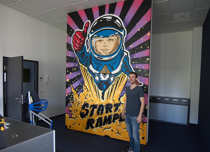 Die Startrampe ist ein Coworking-Space in Wolkersdorf. Gegründet wurde die Initiative von der Ersten Bank. Die Bank sieht sich als Unterstützer der Start-Up Szene und bietet Büroräumlichkeiten zu einem günstigen Preis an. Die Büroräume wurden mit Rigipswänden unterteilt. Dadurch entstand eine große weiße Fläche, die bespielt werden sollte. Beim Designkonzept ging es um die Illustration einer Astronautin die sich von der Startrampe abhebt. Dabei galt es, eine Aufbruchsstimmung zu erzeugen. Die Größe der Leinwand beträgt 3,50m x 2,50m. Materialien: Spraydose, Akrylstift