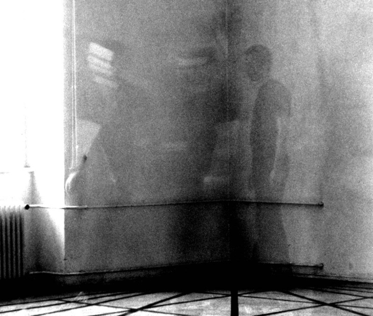 Ein aufgeklebtes Linienraster am Boden bildet ein Bezugssystem, auf das sich der eigene Körper mit seinem Schrittmaß – seinen Körpermaßen bezieht. Der Körper tritt in eine Wechselwirkung mit den Rasterflächen, Rasterlinien und Rasterknotenpunkten, er fungiert als dritte Achse, als vertikale Raumachse. Der Körper läßt sich auf einen definierten Raum ein und lotet diesen aus – ein Abtasten von Raumknotenpunkten und Raumschwerpunkten. Der Körper durchschneidet als vertikale Schnittlinie den Raum und erzeugt immaginäre Schnittflächen. Die vorgegebene Symetrie und Geometrie des „Spielfeldes“ wird teils akzentuiert, teils dekonstruiert. Die „Spielfigur“ wird Teil der Architektur, der Körper wird zum Architekturelement, er schafft Raum und macht Raum sichtbar. Mit Hilfe von Mehrfachbelichtungen werden diese neuen Räume, Raumschnittflächen und Raumelemente abgebildet und nachvollziehbar. Während die fotografischen Mehrfachbelichtungen eine sehr formale – ästhetisch strenge Qualität besitzen, versuchte ich dieser „Strenge“ in den Videosequenzen entgegenzuwirken. Wird das geometrische Raumraster in den einzelnen Fotos mit meinem Körper akzentuiert, in gewissem Sinne wissenschaftlich durchleuchtet – es herrscht eine vorgegebene, beinahe mathematische Versuchsanordnung vor – so soll andererseits in der Videosequenz diese wissenschaftliche Versuchsanordnung durch die spontane Gestik des tanzenden Körpers durchbrochen werden. Markus Wintersberger 1993